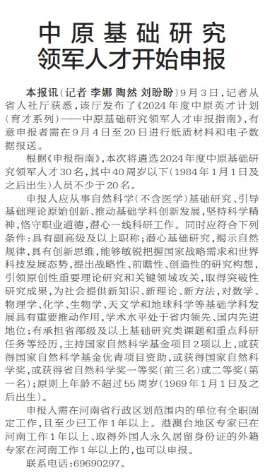 9月3日,记者从省人社厅获悉,该厅发布了《2024年度中原英才计划(育才系列)——中原基础研究领军人才申报指南》,有意申报者需在9月4日至20日进行纸质材料和电子数据报送。(今日《郑州日报》2版)