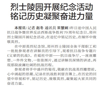昨日是中国人民抗日战争暨世界反法西斯战争胜利79周年纪念日,郑州烈士陵园开展纪念活动,在追忆中铭记历史,在缅怀中致敬英烈。(今日《郑州日报》2版)