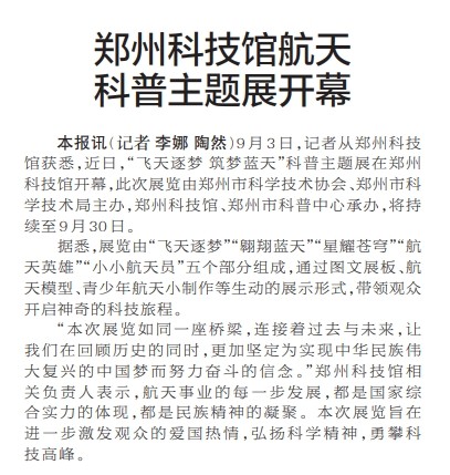 9月3日,记者从郑州科技馆获悉,近日,“飞天逐梦 筑梦蓝天”科普主题展在郑州科技馆开幕,此次展览由郑州市科学技术协会、郑州市科学技术局主办,郑州科技馆、郑州市科普中心承办,将持续至9月30日。(今日《郑州日报》2版)