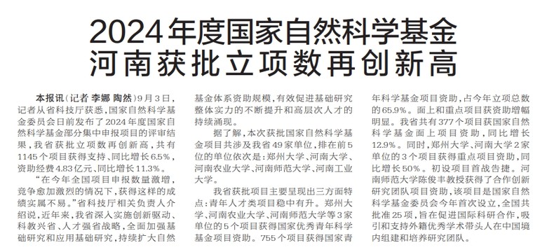 9月3日,记者从省科技厅获悉,国家自然科学基金委员会日前发布了2024年度国家自然科学基金部分集中申报项目的评审结果,我省获批立项数再创新高,共有1145个项目获得支持、同比增长6.5%,资助经费4.83亿元、同比增长11.3%。(今日《郑州日报》2版)