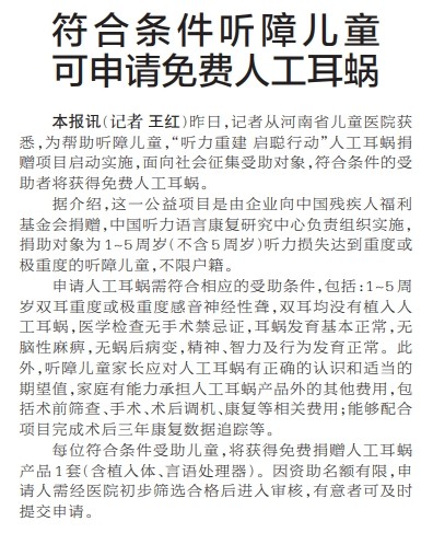 昨日,记者从河南省儿童医院获悉,为帮助听障儿童,“听力重建 启聪行动”人工耳蜗捐赠项目启动实施,面向社会征集受助对象,符合条件的受助者将获得免费人工耳蜗。(今日《郑州日报》2版)