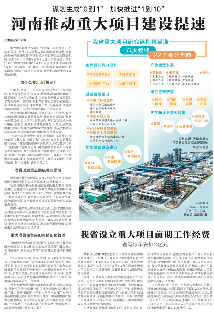 重大项目是经济发展的“生命线”,既影响当下,更决定未来。9月3日,记者从省发展改革委获悉,省政府办公厅近日印发《河南省重大项目研究谋划储备机制(试行)》(以下简称《机制》),进一步做好重大项目“0到1”的谋划生成和“1到10”的加快推进,推动形成“谋划一批、储备一批、建设一批”的滚动接续机制,切实增强有效益的投资对稳增长、优结构、惠民生的支撑带动作用。(今日《河南日报》3版)