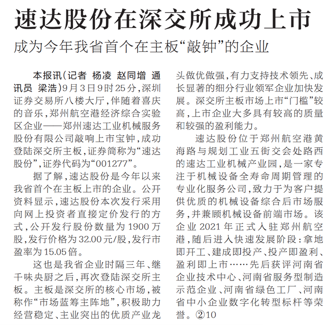 9月3日9时25分,深圳证券交易所八楼大厅,伴随着喜庆的音乐,郑州航空港经济综合实验区企业——郑州速达工业机械服务股份有限公司敲响上市宝钟,成功登陆深交所主板,证券简称为“速达股份”,证券代码为“001277”。(今日《河南日报》3版)