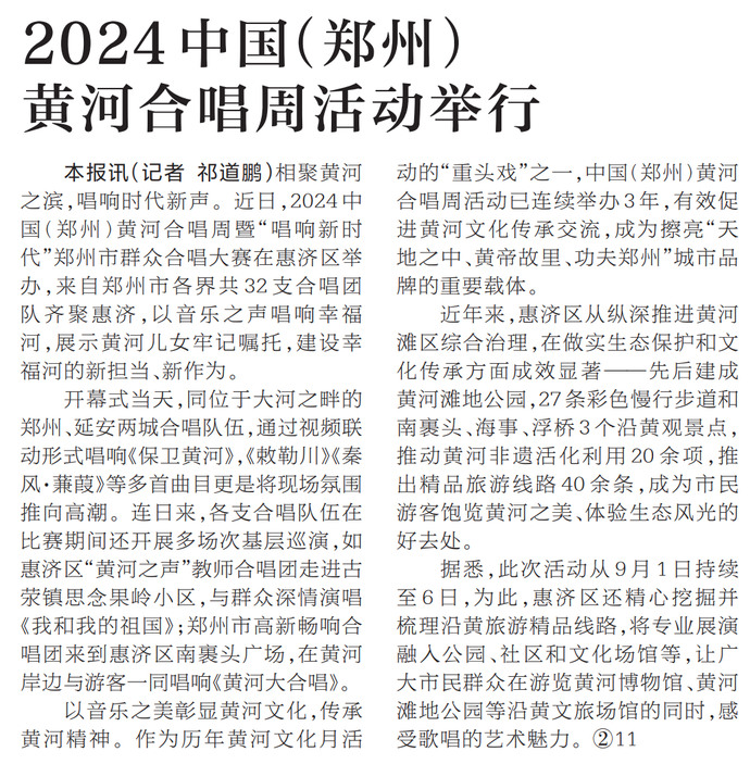 相聚黄河之滨,唱响时代新声。近日,2024中国(郑州)黄河合唱周暨“唱响新时代”郑州市群众合唱大赛在惠济区举办,来自郑州市各界共32支合唱团队齐聚惠济,以音乐之声唱响幸福河,展示黄河儿女牢记嘱托,建设幸福河的新担当、新作为。(今日《河南日报》4版)