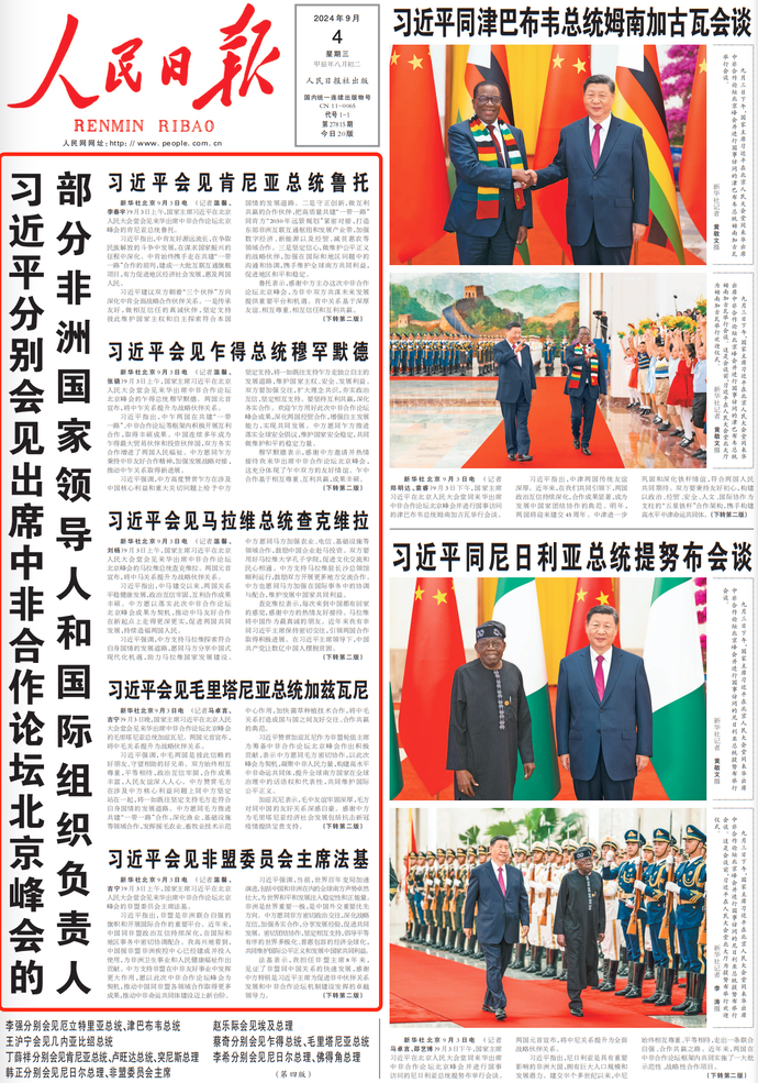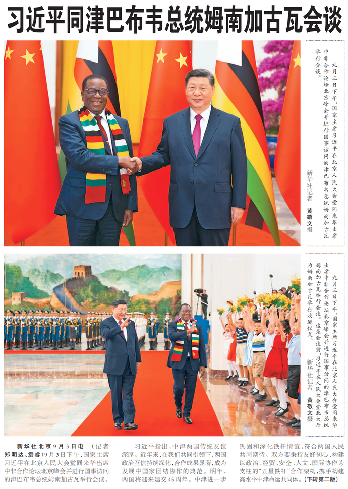 9月3日下午,国家主席习近平在北京人民大会堂同来华出席中非合作论坛北京峰会并进行国事访问的津巴布韦总统姆南加古瓦举行会谈。(今日《人民日报》1版、2版)