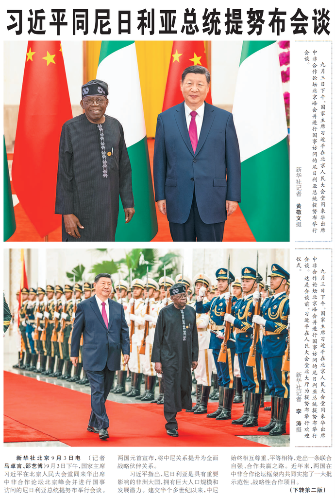 9月3日下午,国家主席习近平在北京人民大会堂同来华出席中非合作论坛北京峰会并进行国事访问的尼日利亚总统提努布举行会谈。两国元首宣布,将中尼关系提升为全面战略伙伴关系。(今日《人民日报》1版、2版)