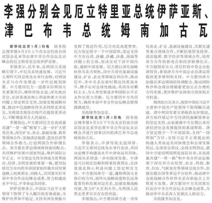 国务院总理李强9月3日上午在北京钓鱼台国宾馆会见来华出席中非合作论坛北京峰会的厄立特里亚总统伊萨亚斯。(今日《人民日报》4版)