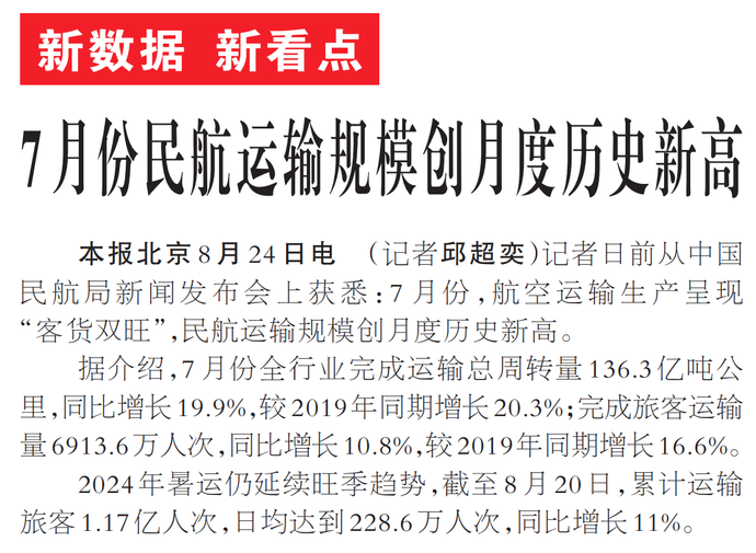 7月份民航运输规模创月度历史新高
