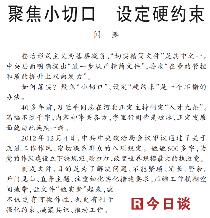 整治形式主义为基层减负,“切实精简文件”是其中之一。中央层面明确提出“进一步从严精简文件”,要求“在量的管控和质的提升上双向发力”。(今日《人民日报》1版)