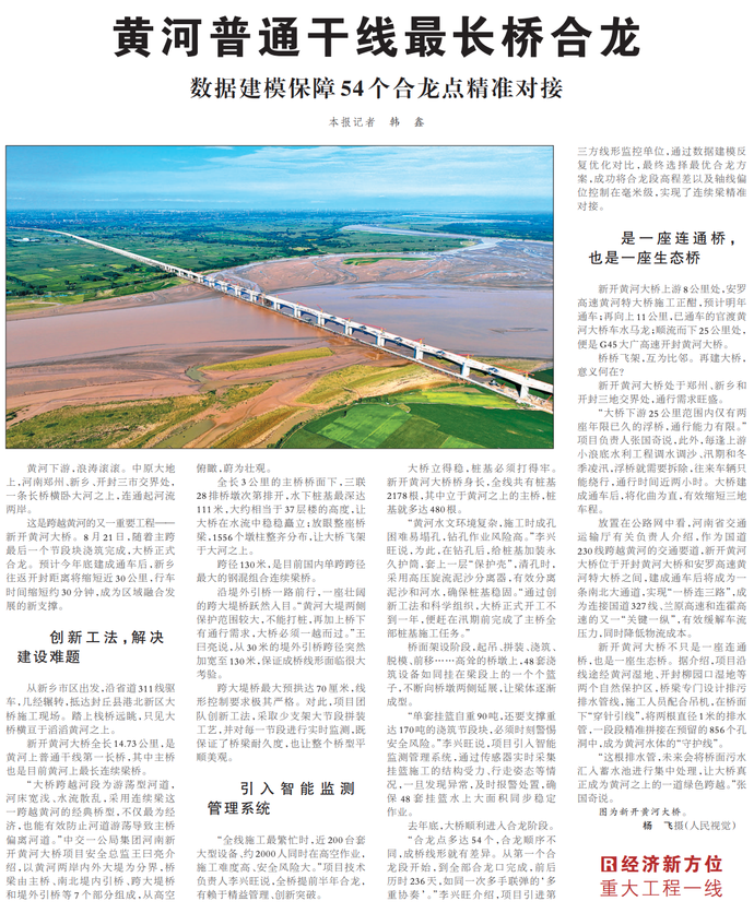 黄河下游,浪涛滚滚。中原大地上,河南郑州、新乡、开封三市交界处,一条长桥横卧大河之上,连通起河流两岸。(今日《人民日报》2版)