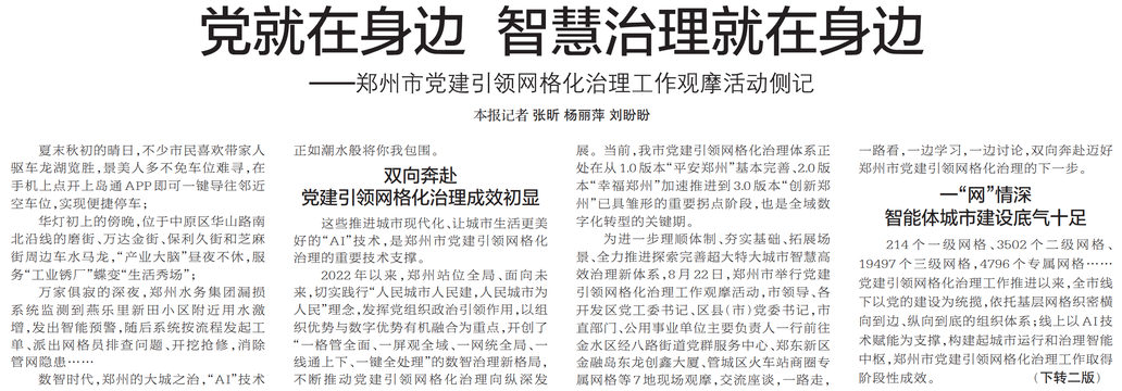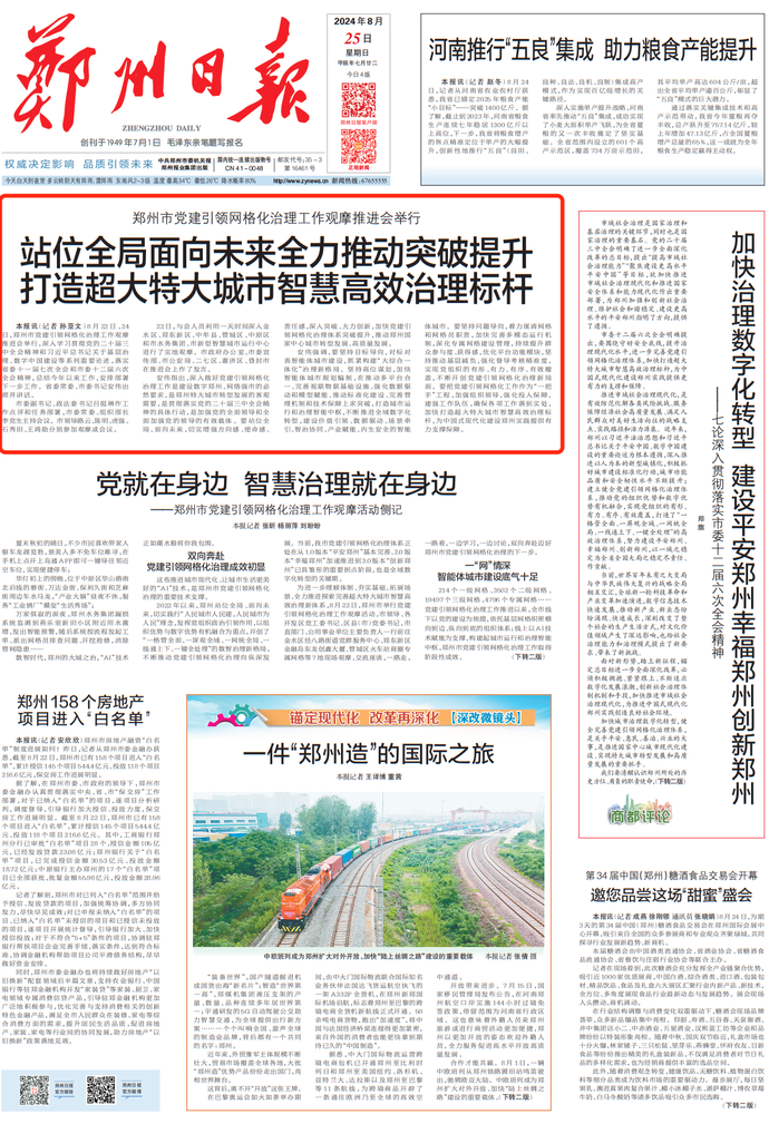 8月22日、24日,郑州市党建引领网格化治理工作观摩推进会举行,深入学习贯彻党的二十届三中全会精神和习近平总书记关于基层治理、数字中国建设等系列重要论述,落实省委十一届七次全会和市委十二届六次全会精神,总结今年以来工作,安排部署下一步工作。省委常委、市委书记安伟出席并讲话。(今日《郑州日报》1版)