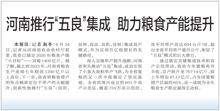 8月24日,记者从河南省农业农村厅获悉,我省已锚定2025年粮食产能“小目标”——突破1400亿斤。据了解,截止到2023年,河南省粮食生产连续七年稳居1300亿斤以上高位,下一步,我省将粮食增产的焦点精准定位于单产的大幅提升,创新性地推行“五良”(良田、良种、良法、良机、良制)集成高产模式,作为实现百亿级增长的关键路径。(今日《郑州日报》1版)