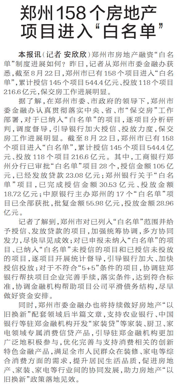 郑州市房地产融资“白名单”制度进展如何?昨日,记者从郑州市委金融办获悉,截至8月22日,郑州市已有158个项目进入“白名单”,累计授信145个项目544.4亿元、投放118个项目216.6亿元,保交房工作进展明显。(今日《郑州日报》1版)
