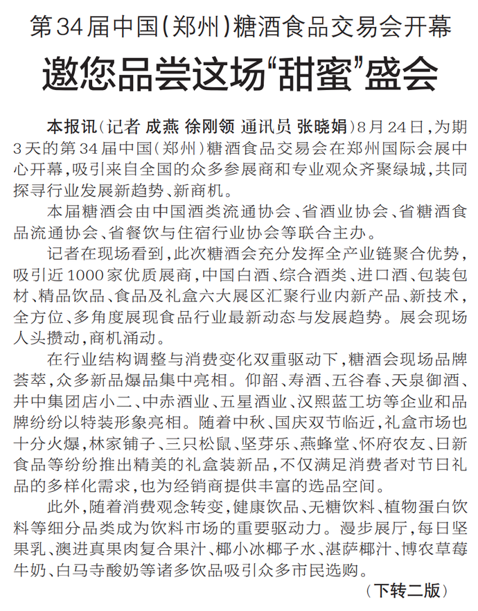 8月24日,为期3天的第34届中国(郑州)糖酒食品交易会在郑州国际会展中心开幕,吸引来自全国的众多参展商和专业观众齐聚绿城,共同探寻行业发展新趋势、新商机。(今日《郑州日报》1版、2版)