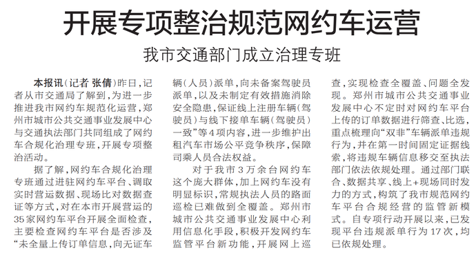 昨日,记者从市交通局了解到,为进一步推进我市网约车规范化运营,郑州市城市公共交通事业发展中心与交通执法部门共同组成了网约车合规化治理专班,开展专项整治活动。(今日《郑州日报》2版)