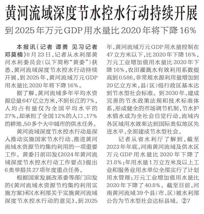 8月23日,记者从水利部黄河水利委员会(以下简称“黄委”)获悉,黄河流域深度节水控水行动持续开展,到2025年,黄河流域万元GDP用水量比2020年将下降16%。(今日《河南日报》1版)