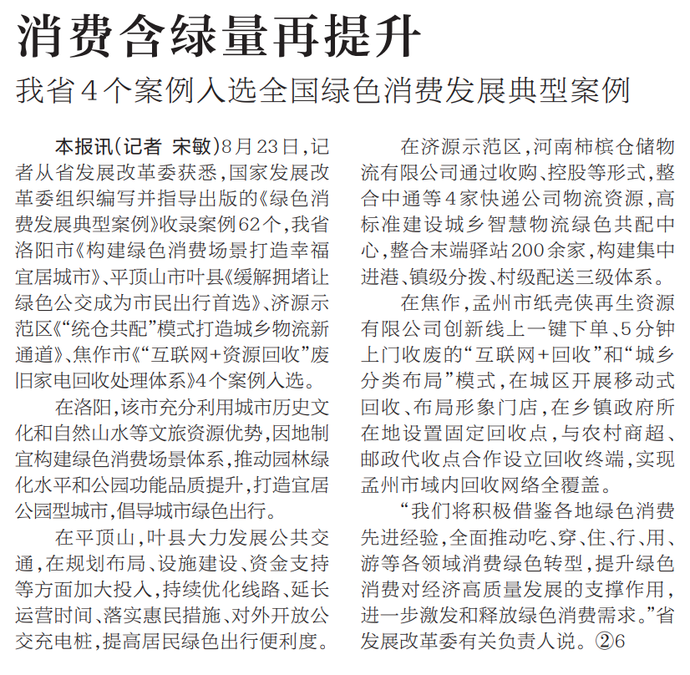 8月23日,记者从省发展改革委获悉,国家发展改革委组织编写并指导出版的《绿色消费发展典型案例》收录案例62个,我省洛阳市《构建绿色消费场景打造幸福宜居城市》、平顶山市叶县《缓解拥堵让绿色公交成为市民出行首选》、济源示范区《“统仓共配”模式打造城乡物流新通道》、焦作市《“互联网+资源回收”废旧家电回收处理体系》4个案例入选。(今日《河南日报》1版)