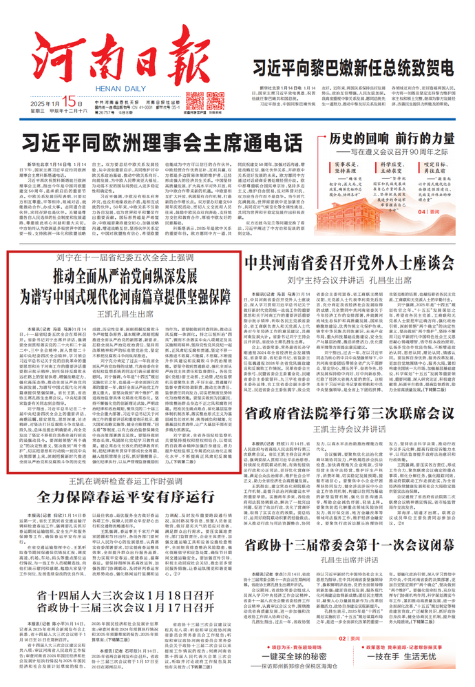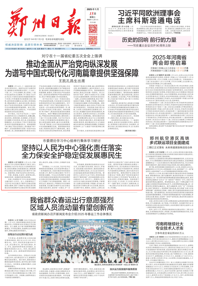 1月14日,2025年省两会新闻发布会召开。省政协十三届三次会议将于1月17日至20日在郑州召开。(今日《河南日报》1版、2版)