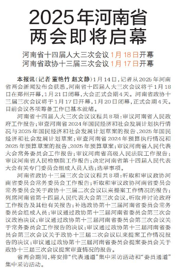 1月14日,记者从2025年省两会新闻发布会上获悉,省十四届人大三次会议将于1月18日至21日在郑州召开。(今日《河南日报》1版、2版)