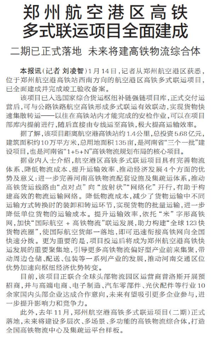 1月14日,记者从郑州航空港区获悉,位于郑州航空港高铁站西南方向的航空港区高铁多式联运项目,已全面建成并完成竣工验收备案。(今日《郑州日报》1版)