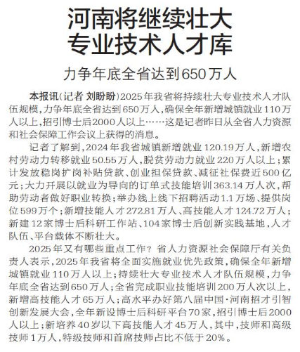 2025年我省将持续壮大专业技术人才队伍规模,力争年底全省达到650万人,确保全年新增城镇就业110万人以上,招引博士后2000人以上……这是记者昨日从全省人力资源和社会保障工作会议上获得的消息。(今日《郑州日报》1版)