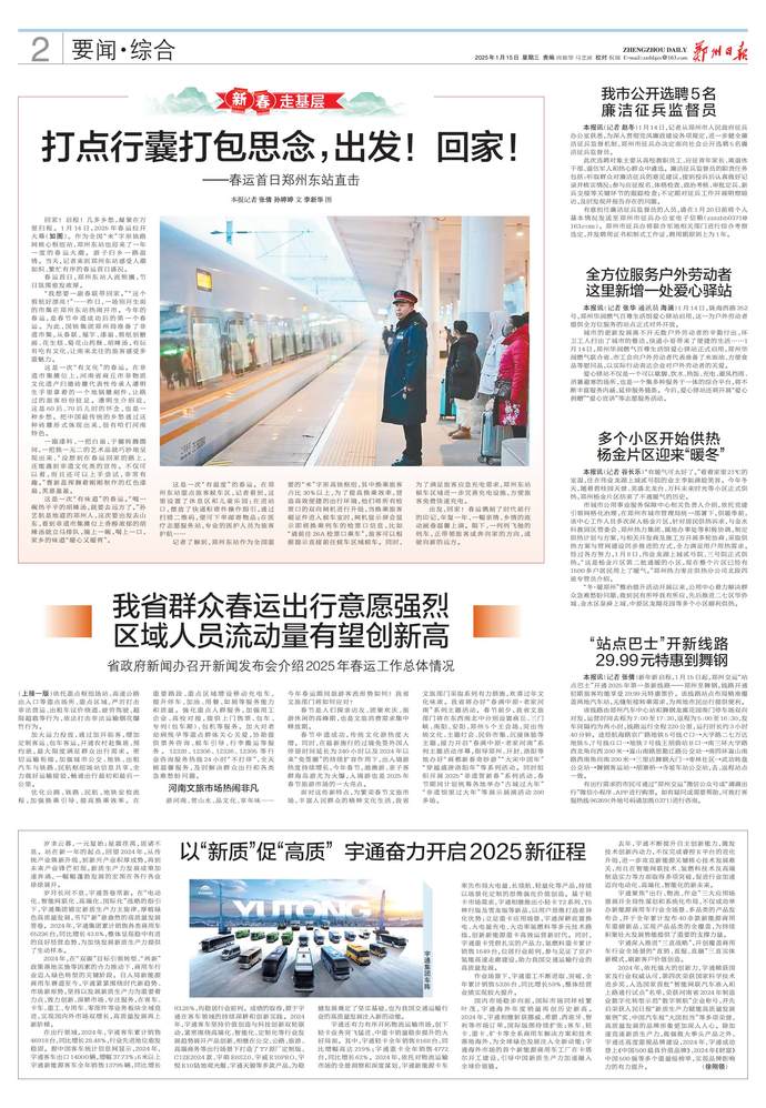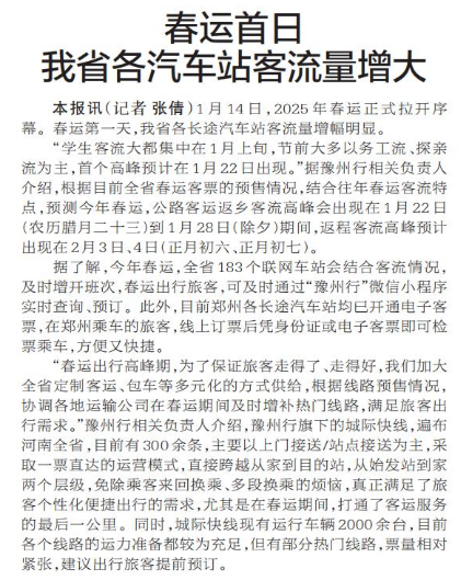 1月14日,2025年春运正式拉开序幕。春运第一天,我省各长途汽车站客流量增幅明显。(今日《郑州日报》5版)