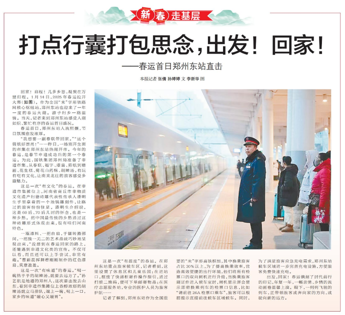 回家!启程!几多乡愁,凝聚在万里归程。1月14日,2025年春运拉开大幕。作为全国“米”字形铁路网核心枢纽站,郑州东站也迎来了一年一度的春运大潮。游子归乡一路温情。当天,记者来到郑州东站感受人潮如织、繁忙有序的春运首日盛况。(今日《郑州日报》2版)
