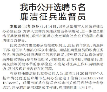 1月14日,记者从郑州市人民政府征兵办公室获悉,为深入贯彻党风廉政建设各项规定,进一步健全廉洁征兵监督机制,郑州市征兵办决定面向社会公开选聘5名廉洁征兵监督员。(今日《郑州日报》2版)