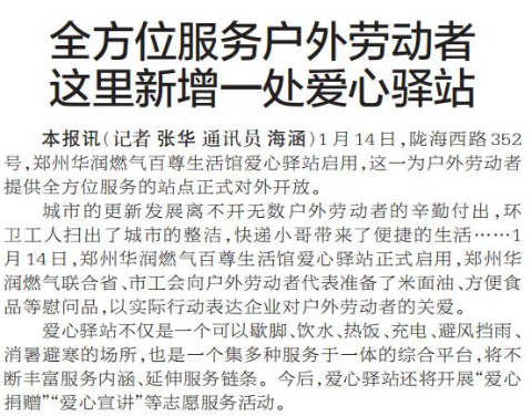 1月14日,陇海西路352号,郑州华润燃气百尊生活馆爱心驿站启用,这一为户外劳动者提供全方位服务的站点正式对外开放。(今日《郑州日报》2版)