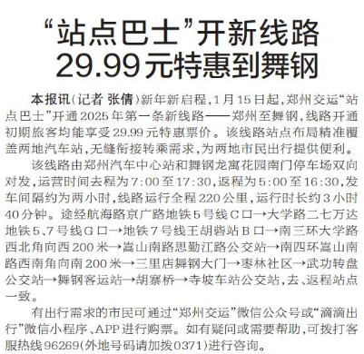 新年新启程,1月15日起,郑州交运“站点巴士”开通2025年第一条新线路——郑州至舞钢,线路开通初期旅客均能享受29.99元特惠票价。该线路站点布局精准覆盖两地汽车站,无缝衔接转乘需求,为两地市民出行提供便利。(今日《郑州日报》2版)