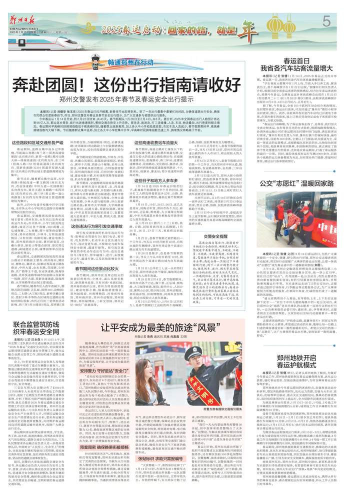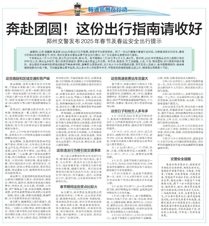 2025年春运已拉开帷幕,新春佳节也即将到来。到了一年出行最集中最繁忙的时段,为确保道路出行安全,确保市民群众欢度新春佳节,昨日,郑州交警发布春运及春节安全出行提示,为广大交通参与者提供出行服务。(今日《郑州日报》5版)