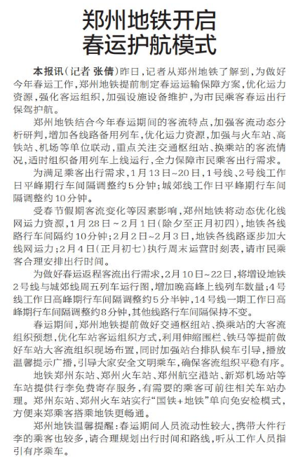 昨日,记者从郑州地铁了解到,为做好今年春运工作,郑州地铁提前制定春运运输保障方案,优化运力资源,强化客运组织,加强设施设备维护,为市民乘客春运出行保驾护航。(今日《郑州日报》5版)