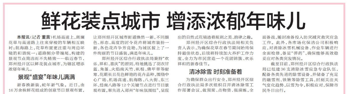 机场高速上,斑斓花草与高速路上往来穿梭的车辆相互映衬;航海路上,花草布置更注重与周边环境的和谐统一;道路侧分带端尾,构建的景观节点简洁而不失精致……临近春节,郑州经开区以鲜花装点城市,为辖区增添浓郁年味儿。(今日《郑州日报》7版)