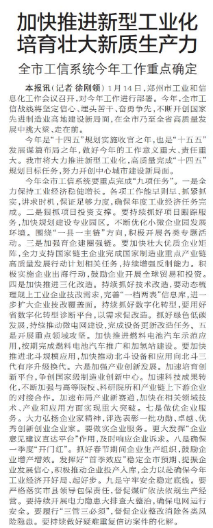 1月14日,郑州市工业和信息化工作会议召开,对今年工作进行部署。今年,全市工信战线将坚定信心、埋头苦干、奋勇争先,不断开创国家先进制造业高地建设新局面,在全市乃至全省高质量发展中挑大梁、走在前。(今日《郑州日报》6版)