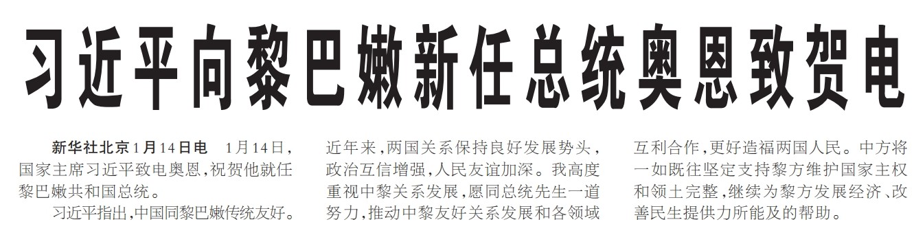 1月14日,国家主席习近平致电奥恩,祝贺他就任黎巴嫩共和国总统。