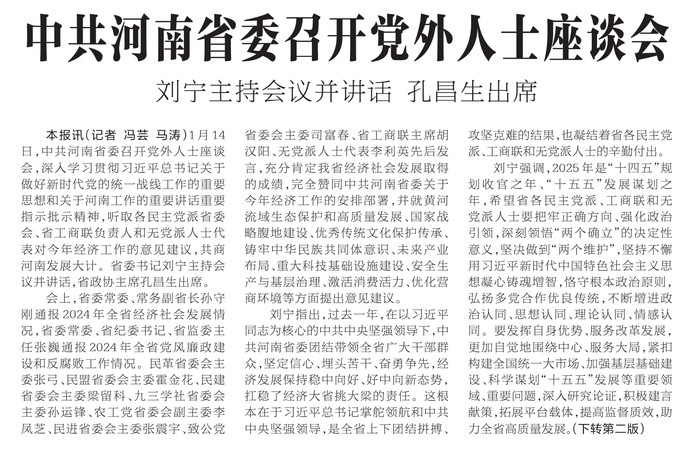 1月14日,中共河南省委召开党外人士座谈会,深入学习贯彻习近平总书记关于做好新时代党的统一战线工作的重要思想和关于河南工作的重要讲话重要指示批示精神,听取各民主党派省委会、省工商联负责人和无党派人士代表对今年经济工作的意见建议,共商河南发展大计。省委书记刘宁主持会议并讲话,省政协主席孔昌生出席。(今日《河南日报》1版、2版)