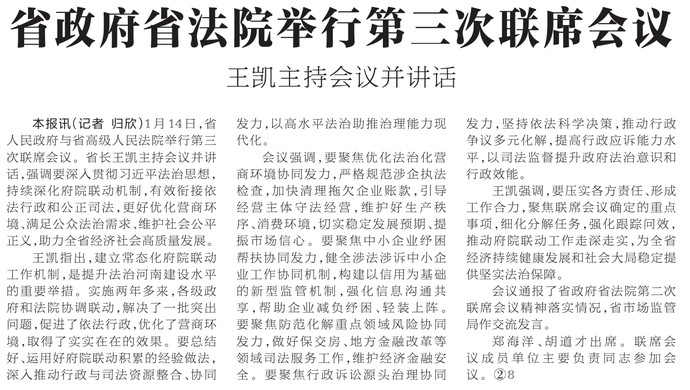 1月14日,省人民政府与省高级人民法院举行第三次联席会议。省长王凯主持会议并讲话,强调要深入贯彻习近平法治思想,持续深化府院联动机制,有效衔接依法行政和公正司法,更好优化营商环境、满足公众法治需求、维护社会公平正义,助力全省经济社会高质量发展。(今日《河南日报》1版)