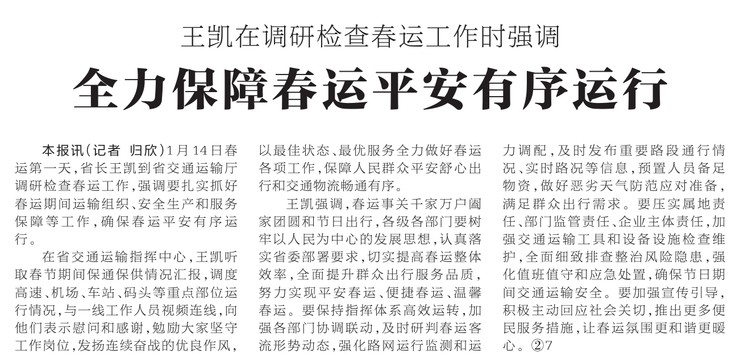 1月14日春运第一天,省长王凯到省交通运输厅调研检查春运工作,强调要扎实抓好春运期间运输组织、安全生产和服务保障等工作,确保春运平安有序运行。(今日《河南日报》1版)