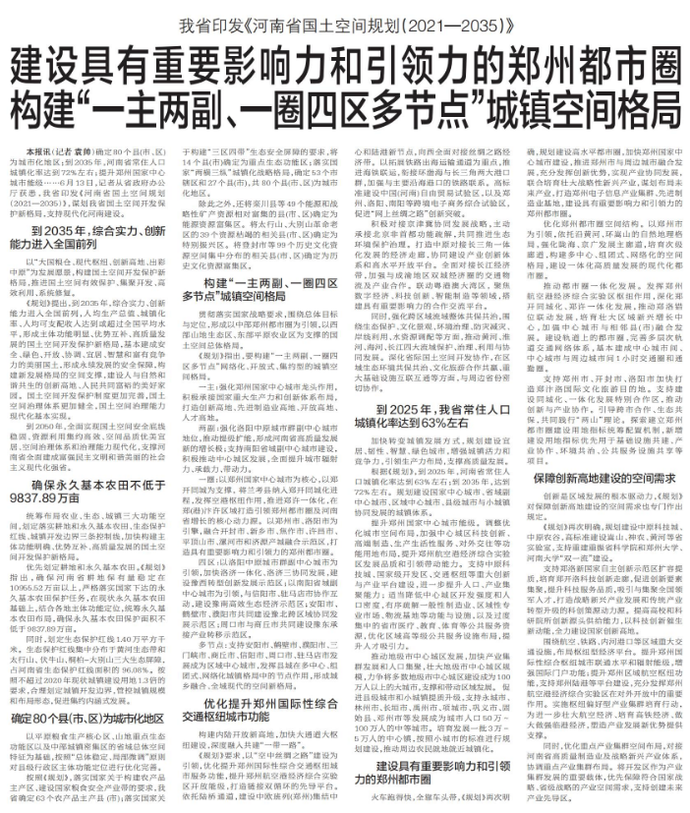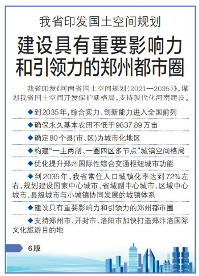 我省印发《河南省国土空间规划(2021—2035)》,谋划我省国土空间开发保护新格局,支持现代化河南建设。(今日《郑州日报》1版、6版)