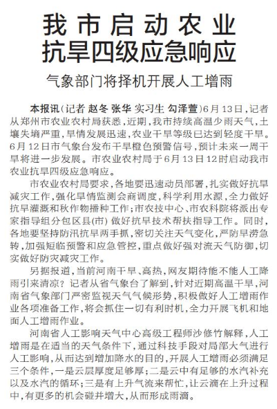 6月13日,记者从郑州市农业农村局获悉,近期,我市持续高温少雨天气,土壤失墒严重,旱情发展迅速,农业干旱等级已达到轻度干旱。6月12日市气象台发布干旱橙色预警信号,预计未来一周干旱将进一步发展。市农业农村局于6月13日12时启动我市农业抗旱四级应急响应。(今日《郑州日报》1版)