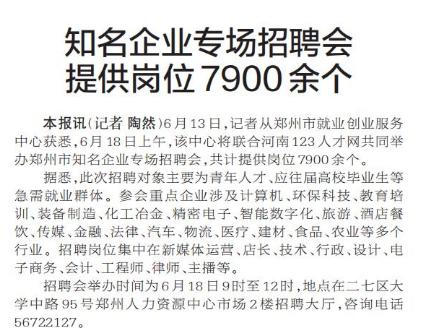 6月13日,记者从郑州市就业创业服务中心获悉,6月18日上午,该中心将联合河南123人才网共同举办郑州市知名企业专场招聘会,共计提供岗位7900余个。(今日《郑州日报》2版)