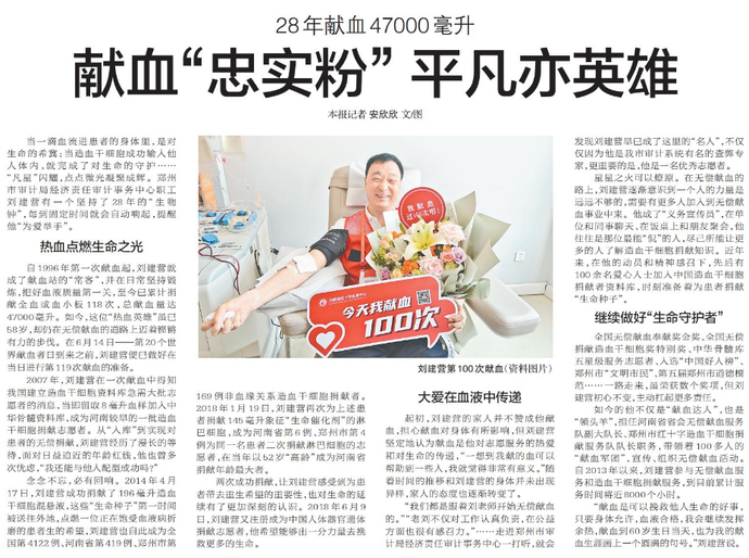 当一滴血流进患者的身体里,是对生命的希冀;当造血干细胞成功输入他人体内,就完成了对生命的守护……“凡星”闪耀,点点微光凝聚成辉。郑州市审计局经济责任审计事务中心职工刘建营有一个坚持了28年的“生物钟”,每到固定时间就会自动响起,提醒他“为爱举手”。(今日《郑州日报》5版)