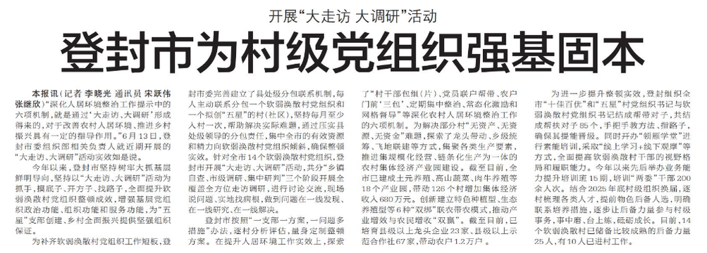 “深化人居环境整治工作提示中的六项机制,就是通过‘大走访、大调研’形成得来的,对于改善农村人居环境、推进乡村振兴具有一定的指导作用。”6月13日,登封市委组织部相关负责人就近期开展的“大走访、大调研”活动实效如是说。(今日《郑州日报》7版)