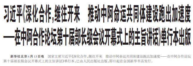 习近平《深化合作,继往开来 推动中阿命运共同体建设跑出加速度——在中阿合作论坛第十届部长级会议开幕式上的主旨讲话》单行本出版