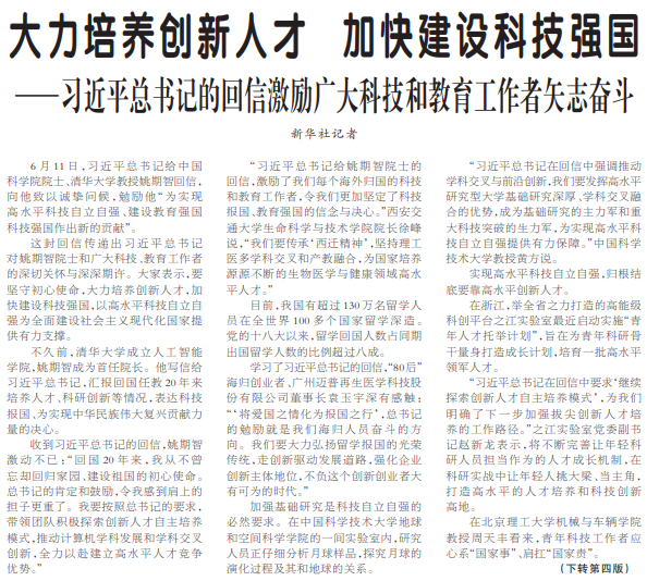 6月11日,习近平总书记给中国科学院院士、清华大学教授姚期智回信,向他致以诚挚问候,勉励他“为实现高水平科技自立自强、建设教育强国科技强国作出新的贡献”。(今日《人民日报》1版、4版)