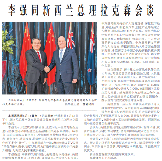 当地时间6月13日下午,国务院总理李强在惠灵顿总督府同新西兰总理拉克森举行会谈。(今日《人民日报》1版)