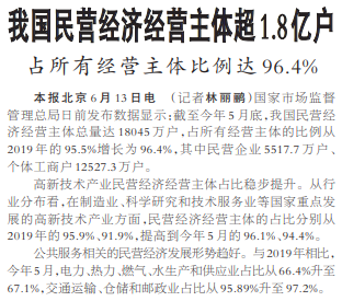 国家市场监督管理总局日前发布数据显示:截至今年5月底,我国民营经济经营主体总量达18045万户,占所有经营主体的比例从2019年的95.5%增长为96.4%,其中民营企业5517.7万户、个体工商户12527.3万户。(今日《人民日报》1版)
