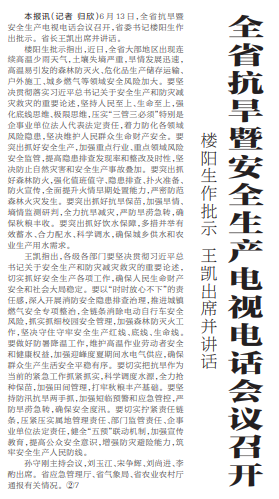 6月13日,全省抗旱暨安全生产电视电话会议召开,省委书记楼阳生作出批示。省长王凯出席并讲话。