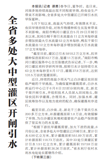 春争日,夏争时。连日来,河南多地持续高温出现不同程度旱情,给农业生产带来不利影响,全省多处大中型灌区已开闸引水抗旱保夏种。(今日《河南日报》1版、3版)