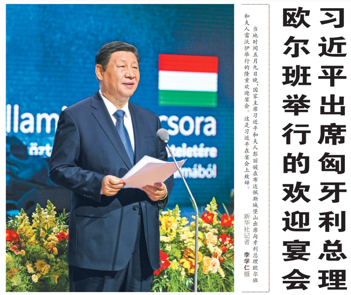 当地时间五月九日晚,国家主席习近平和夫人彭丽媛在布达佩斯城堡山出席匈牙利总理欧尔班和夫人雷沃伊举行的隆重欢迎宴会。这是习近平在宴会上致辞。(今日《人民日报》1版)